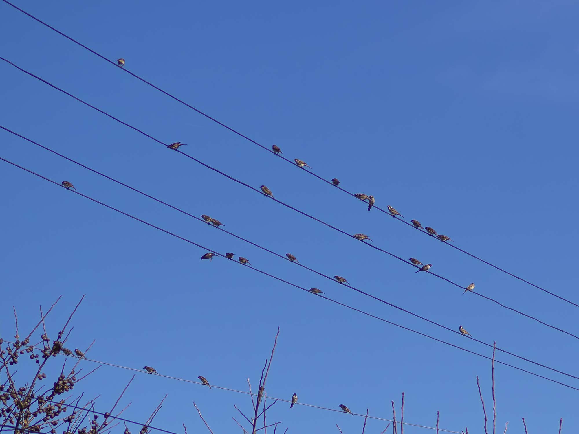 だいぶ寒くなって来ましたね。皆さん、いかがお過ごしですか。青空の下、スズメが並んでました。ちょっと可愛らしかったです。